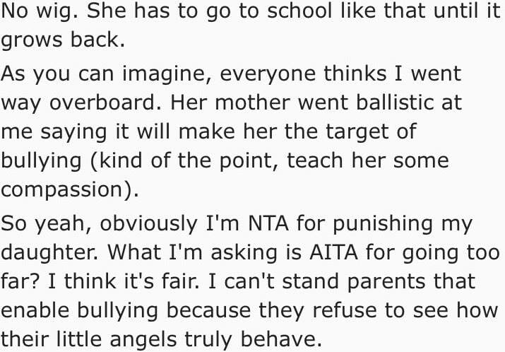 “My daughter knows this and that is what really disgusted me with her behavior. It demonstrated a complete and utter lack of empathy. I hoped that her going to school bald and walking a mile in the other girl’s shoes would teach her a lesson.”