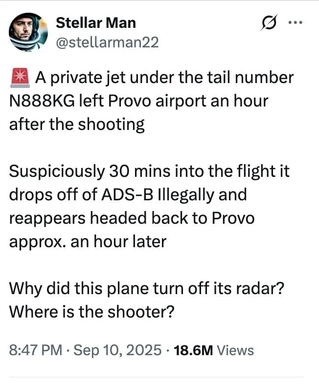 This now-deleted post on X, which had received close to 19 million views, raised questions as to why a private jet, flying under the designation N888KG, left Utah’s Provo Airport shortly after the shooting. It also notes that the flight’s transponder signal was lost roughly 30 minutes later, stating it “illegally turns off ADS-B radar.” ADS-B radar refers to flight tracking technology that broadcasts plane positions, viewable via sites like ADS-B Exchange.