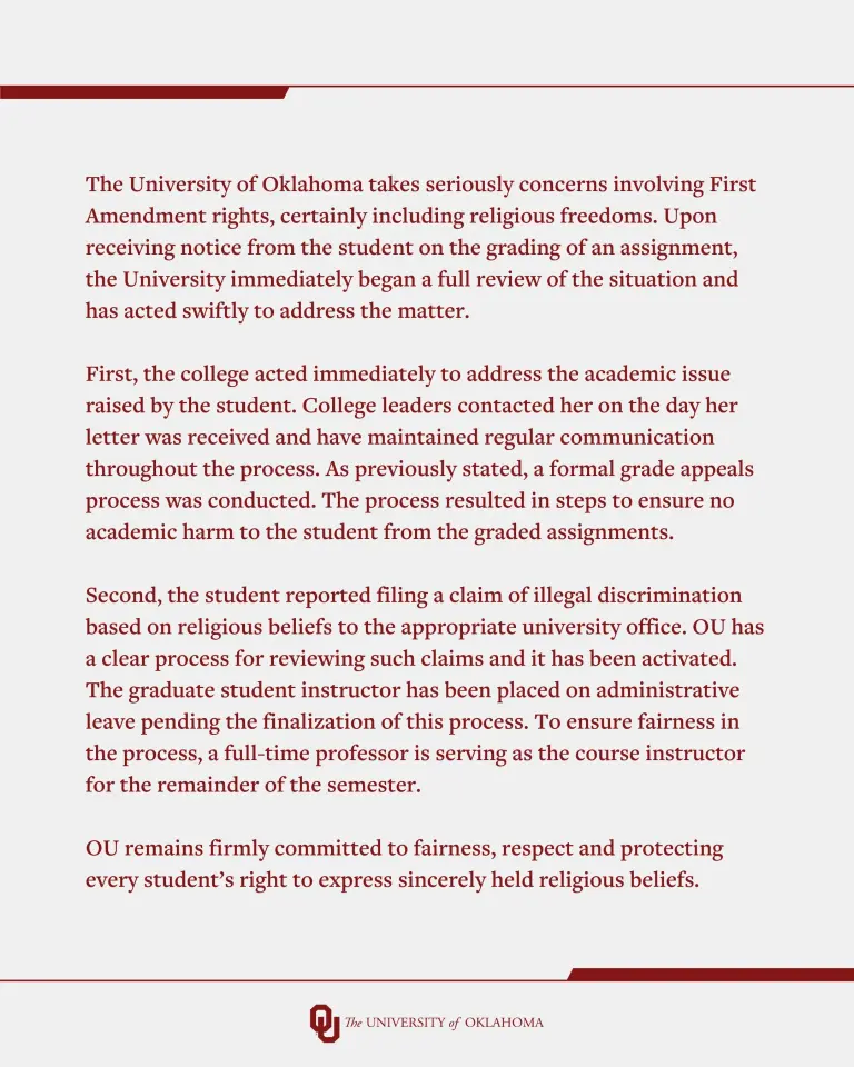 “The University of Oklahoma takes seriously concerns involving First Amendment rights, certainly including religious freedoms,” the university said in a statement.