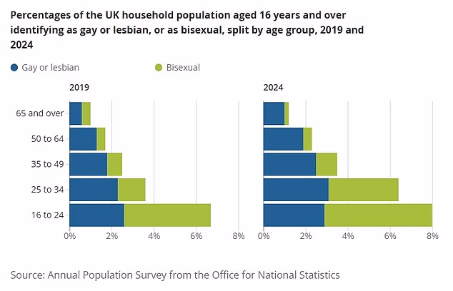 Emily Knipe of the ONS said: ‘While the people in their late teens and early 20s are the most likely to identify as lesbian, gay or bisexual, in 2024 we saw the fastest growth in the LGB population among people in their late 20s and early 30s.