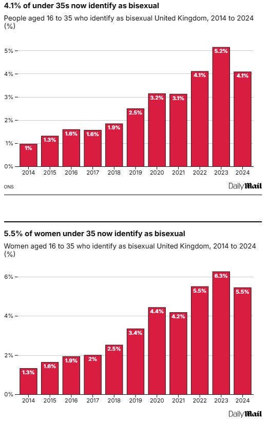 Analysis of the ONS data shows that in 2014 1 per cent of under-35s classed themselves as bisexual. By last year that had risen to 4.1 per cent. However, the figure was down from a peak of 6.3 per cent in 2023. Among women, 1.3 per cent said they were bisexual in 2014, rising to 5.5 per cent last year. But in 2023 the proportion reached 6.3 per cent.