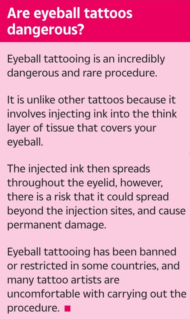 Scroll down to read more about the potential dangers of eyeball tattoos