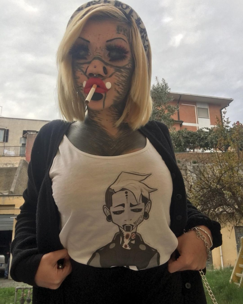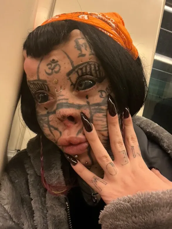 The 23-year-old has even removed her nose and naval, had implants inserted into her forehead, got multiple tattoos and “scarification”, and had her eyeballs tattooed.