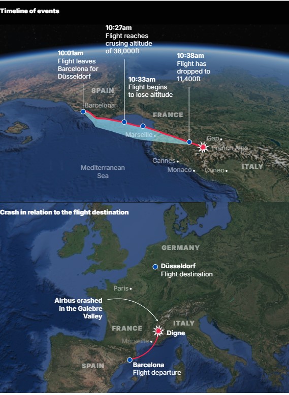 The Airbus A320 took off from Barcelona’s El Prat at 10am local time (9am GMT) on March 24 as scheduled.