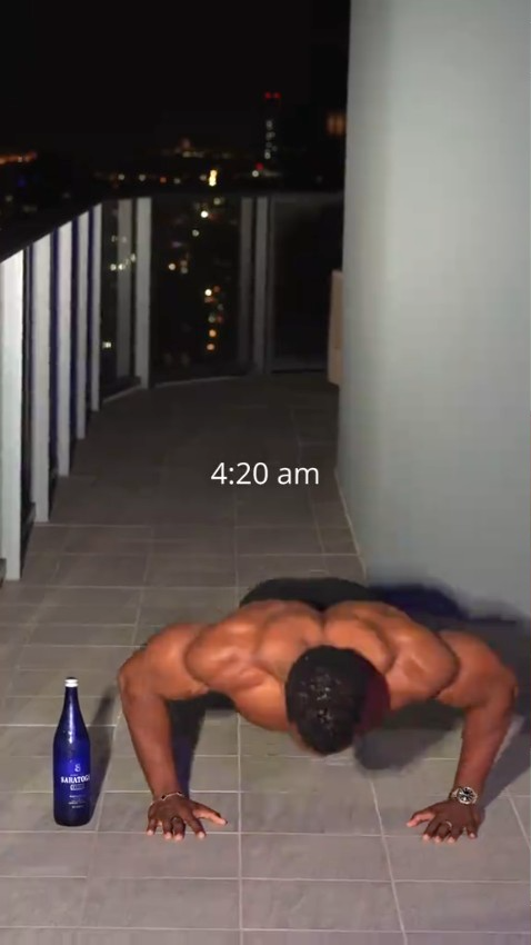 The video is captioned, “The Morning routine. Easy routes don’t pay well, get up.” While doing press-ups on the balcony, he knocks over a bottle of his precious Saratoga water. An assistant picks up the broken shards while he watches sport on an iPad.