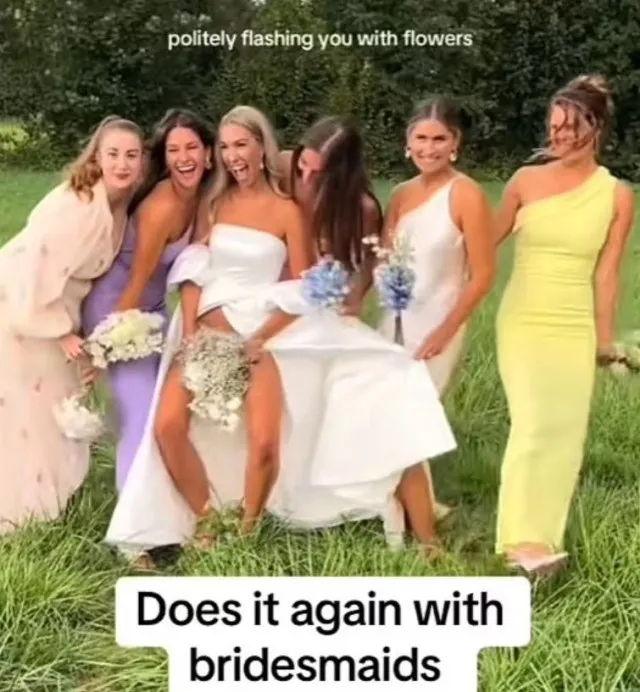 She lifted her skirt, exposing her underwear, while standing among the groomsmen. Laughter erupted from the group, but not everyone found it amusing. In another clip, she repeated the stunt while holding her bouquet over her underwear.