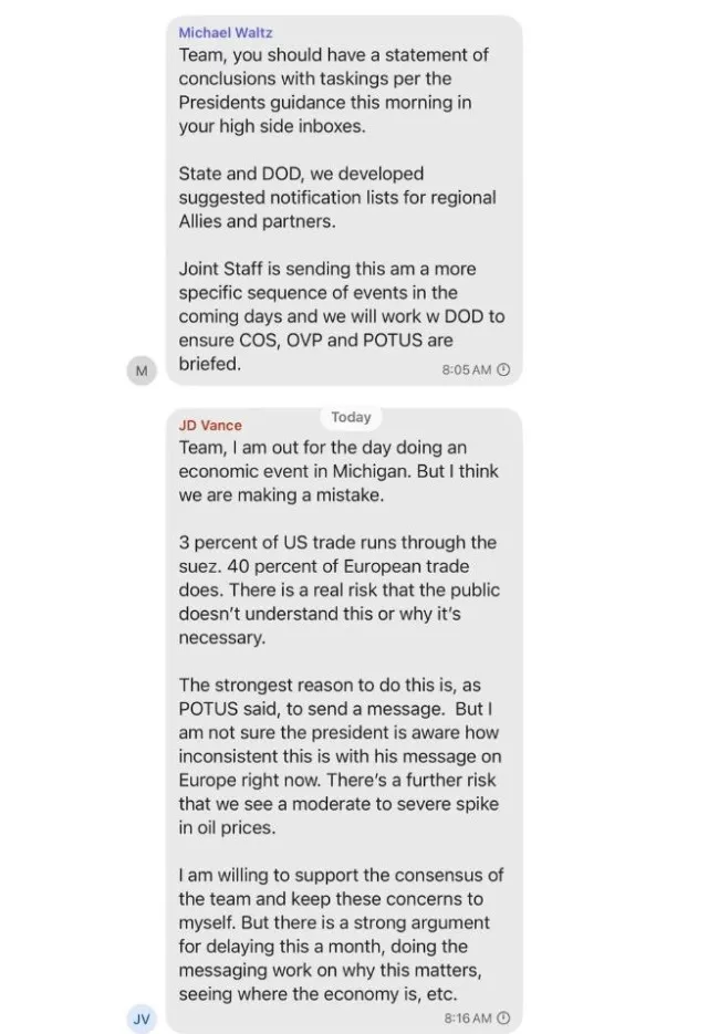 A private group chat involving senior Trump officials has been leaked. The messages detail U.S. war plans in Yemen.