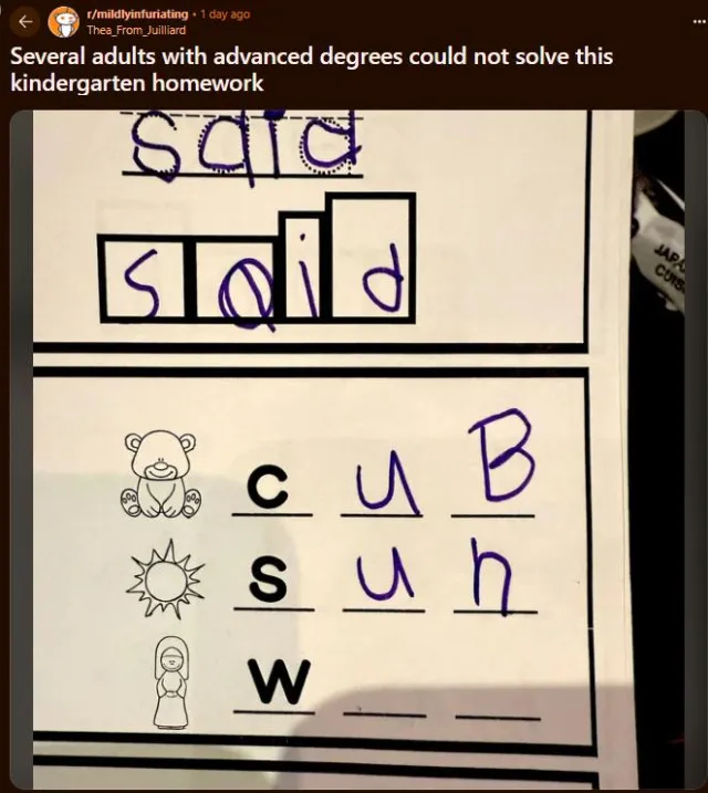 They believed to be a mother, posted a picture of her child’s homework. The task required the kindergartener to look at outlined images and write the corresponding three-letter words.