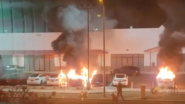 Accoring to police, the suspect used a rifle to damage surveillance cameras before setting five Tesla vehicles on fire.