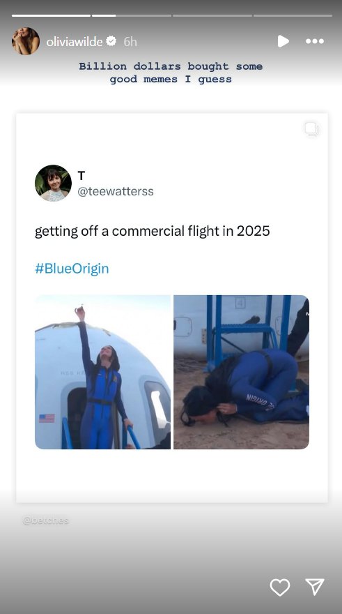 Olivia Wilde shared a meme on her social media that showed Katy Perry kissing the ground with the caption: ‘Getting off a commercial flight in 2025 #BlueOrigin.’
