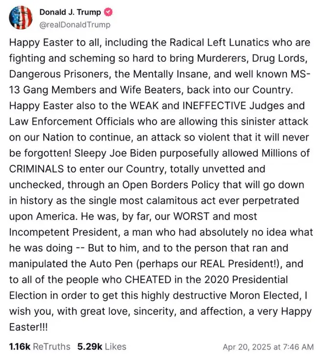 Posting on Sunday, Trump’s full message read: “Happy Easter to all, including the Radical Left Lunatics who are fighting and scheming so hard to bring Murderers, Drug Lords, Dangerous Prisoners, the Mentally Insane, and well known MS- 13 Gang Members and Wife Beaters, back into our Country.