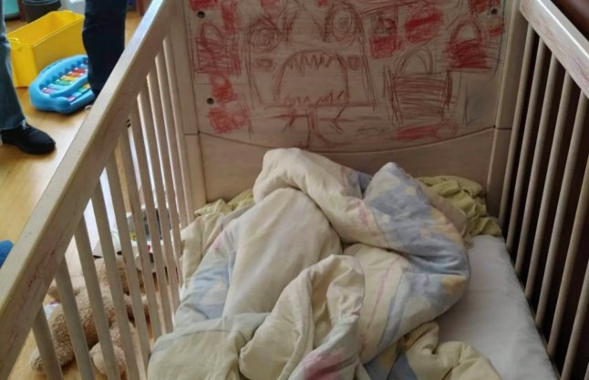 Photos taken inside the house reveal the boys’ beds covered with disturbing drawings.