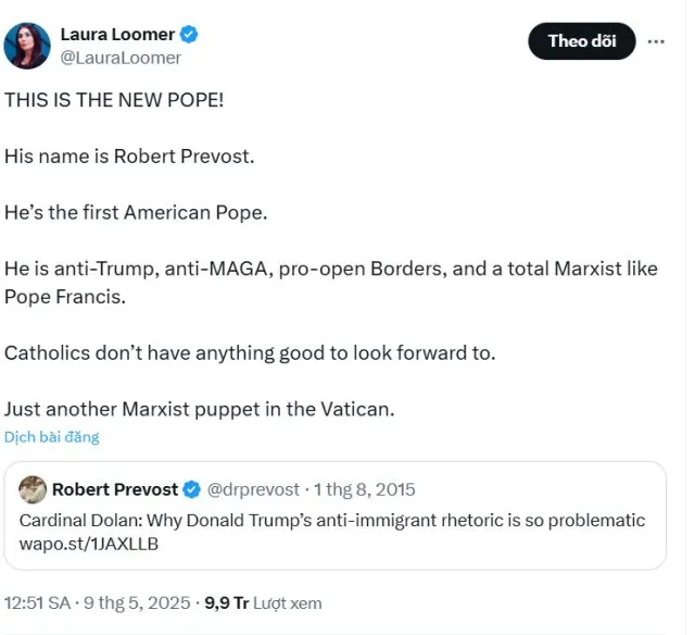 On X (formerly Twitter), she labeled the newly elected pope a “woke Marxist puppet”. She also accused him of being anti-Trump.