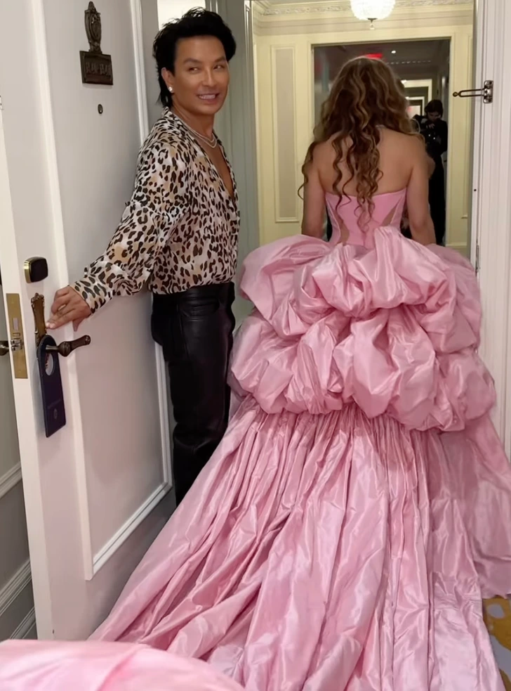 Shakira needed help from three bodyguards to manage the dramatic train of her gown while walking the Met Gala carpet. “My legs are shaking just trying to balance it,” she told a news media outlet.