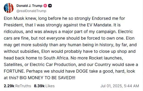‘No more Rocket launches, Satellites, or Electric Car Production, and our Country would save a FORTUNE. Perhaps we should have DOGE take a good, hard look at this? BIG MONEY TO BE SAVED!!!’