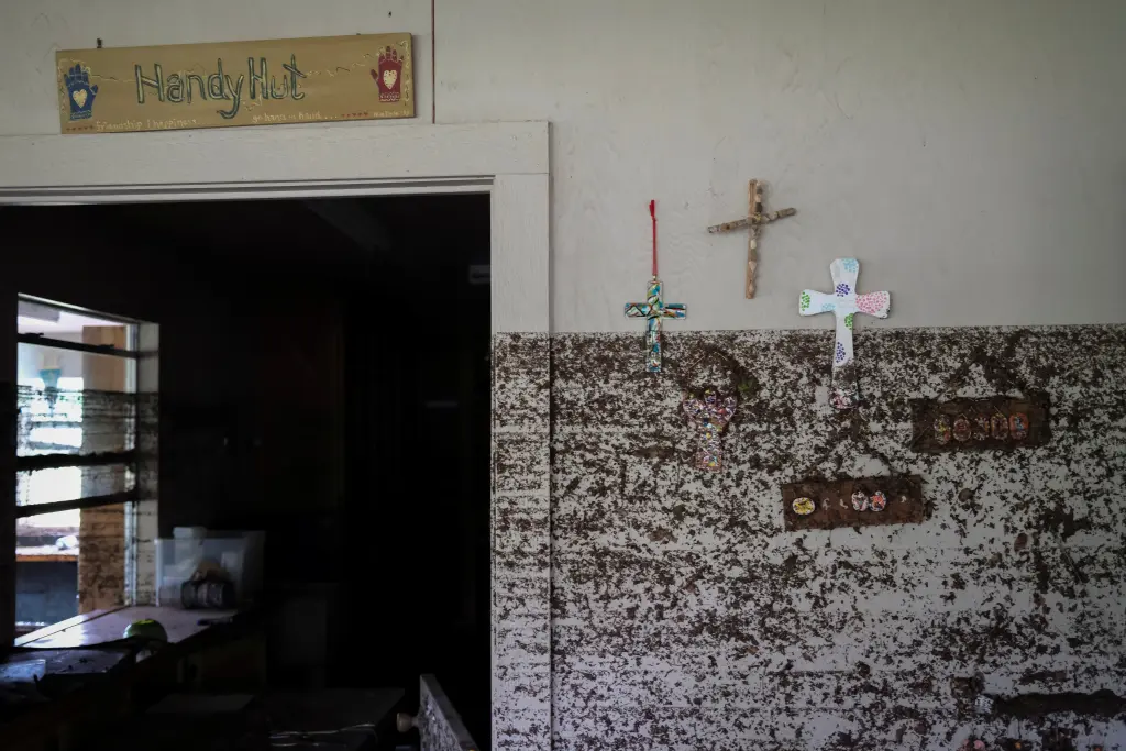 Photos of inside a nearby cabin, the Handy Hut, shows the water rose nearly to the top of the door frame before receding.