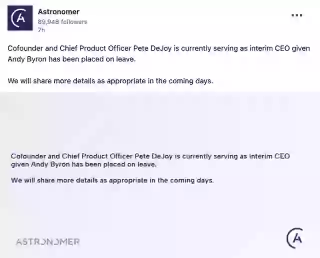 Now in an update shared to LinkedIn, Astronomer announced that Bryon has been placed on leave.