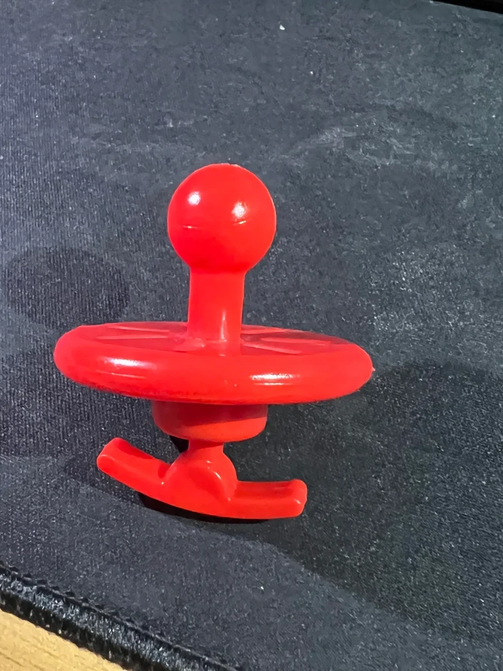 “Material is like a firm, but slightly soft red plastic. Slightly larger than a pacifier in size. Doesn’t smell like anything. What is it?”