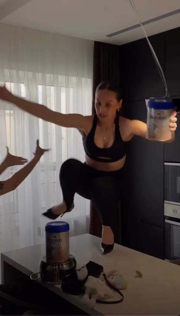 Video posted by Barutkina on Instagram shows her attempting to one-foot squat in heels on a baby formula container, which is balanced on a sauce pot that is itself placed on a marble-topped kitchen island.
